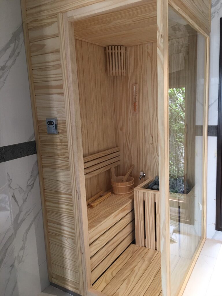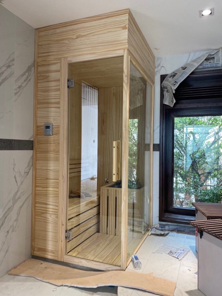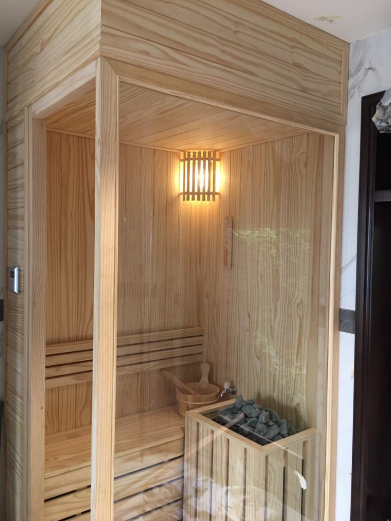 Phòng xông hơi được Vũ Minh Phát thiết kế gỗ kết hợp với kính cường lực tạo cảm giảm thoáng có thể view nhà bên ngoài khi sử dụng. Mang tính thẩm mỹ rất cao.